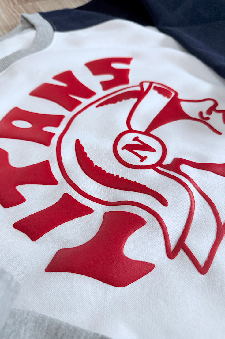 Brand new and soooo good! This one features a colorblock style with a white body, navy sleeve and gray sleeve. The red puff Titan head print creates the perfect contrast and keeps it simple. Unisex sizing so it does run oversized. Consider sizing down for a traditional fit.
