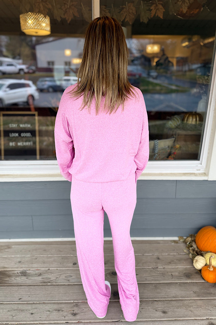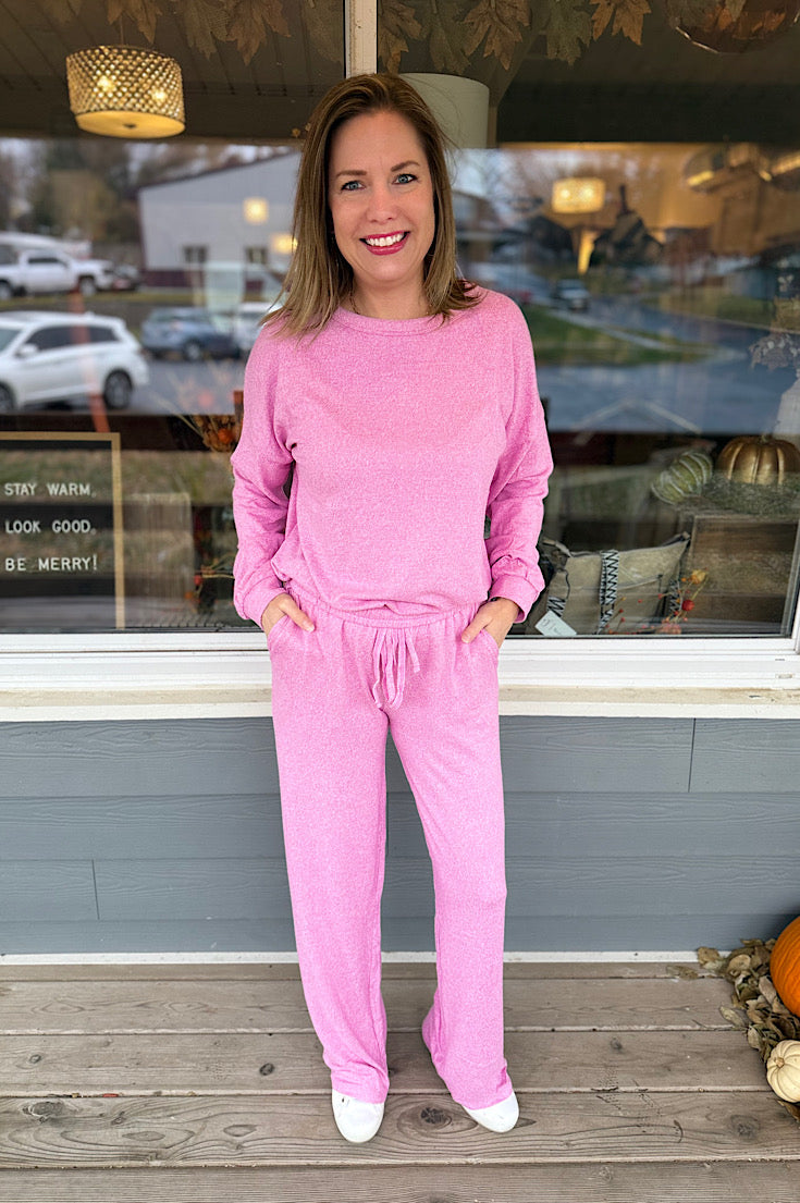 Sink into ultimate comfort with the Amaya Brushed Hacci Lounge Set. Crafted from incredibly soft brushed hacci fabric, this coordinated set features a relaxed long-sleeve top with drop shoulders and banded sleeves paired with matching elastic-waist pants. The full elastic waistband and functioning drawstring ensure a customized fit, while functional pockets add everyday practicality. Perfect for lounging at home or gifting to someone special, this set delivers cozy sophistication without compromising on style or comfort.
