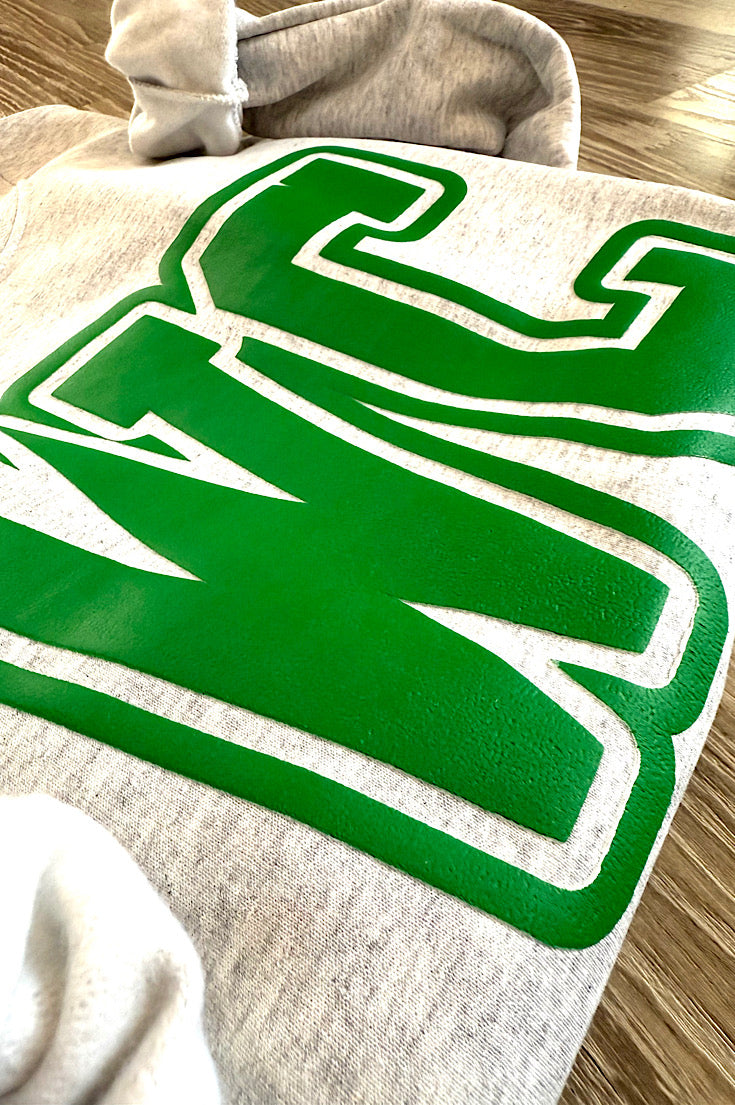 This unisex fleece features a big WC kelly green puff design. These are available in youth and adult and run true to size. We can add a split v-neck to these if you like...if you want the neck cut to a small v, leave that in the notes at checkout. Choose ash gray, black or white sweatshirt.
